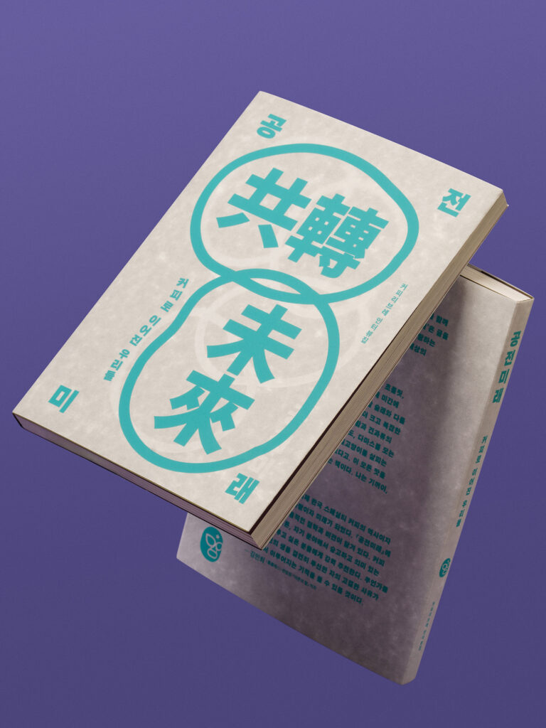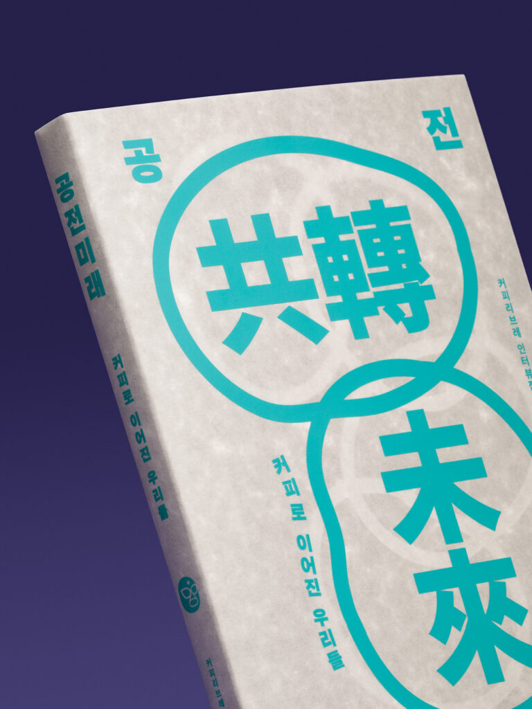 일상의실천은 단행본의 제호인 공전미래(共轉未來)의 의미를 의역한함께 굴러가는 공전미래라는 핵심어를 바탕으로 디자인을 진행했습니다. 원두의 불완전한 원(Circle)의 형태와 우리의 삶의 모양이 닮았다는 맥락에서 시작해, 불완전한 개인이 연결되어 지속가능한 내일로 향해 가는 키비주얼을 표지에 표현했습니다. 또한 인터뷰이가 전하는 말의 호흡을 비정형의 레이아웃으로 나타냈습니다.