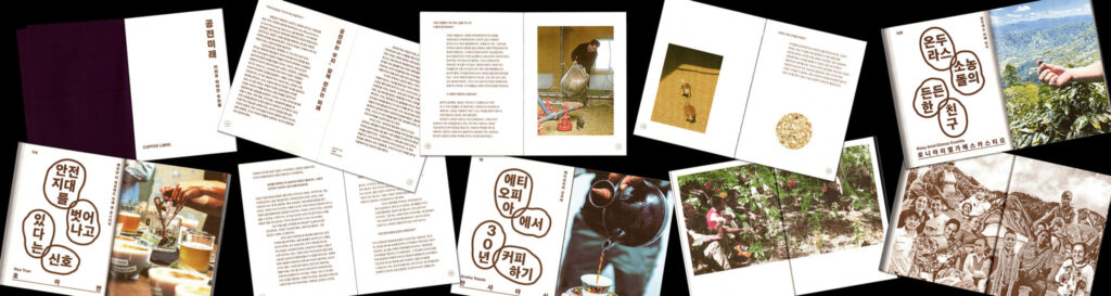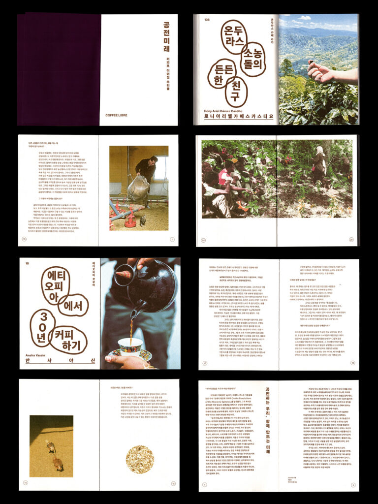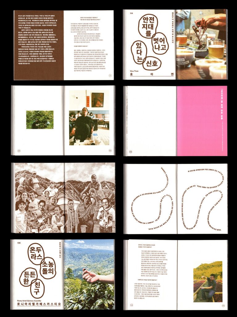 Everyday Practice developed the design based on the core concept “A Future That Rolls Together,” a free translation of the book’s title, Gongjeon Mirae (共轉未來). Starting from the idea that the imperfect circular shape of coffee beans resembles the shape of our lives, the cover features a key visual depicting imperfect individuals connecting to move toward a sustainable tomorrow. Additionally, the rhythm of the interviewees’ words is expressed through an irregular layout.