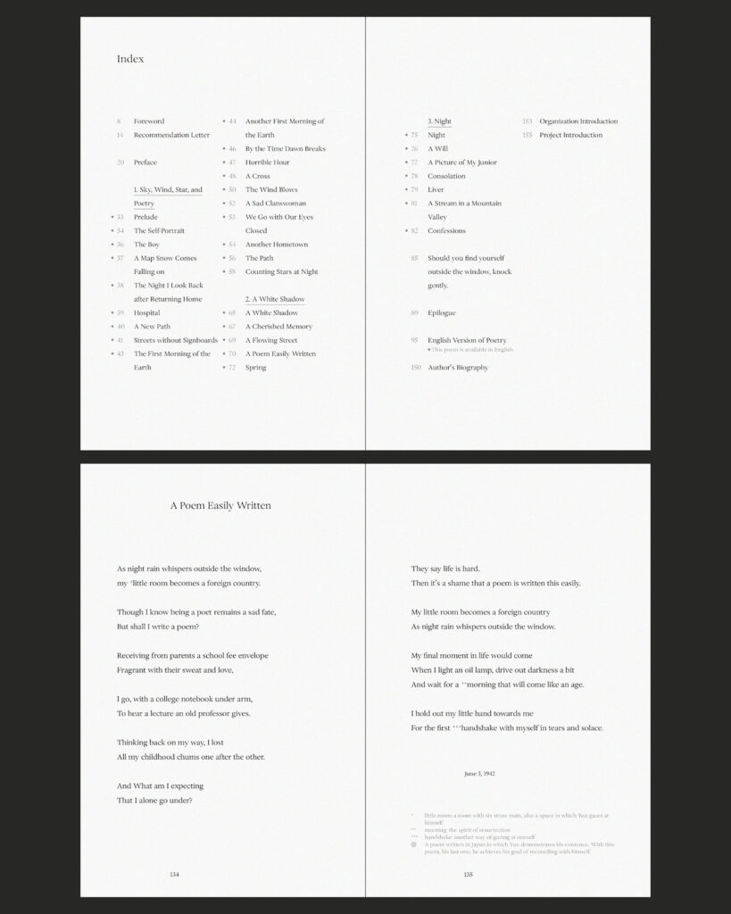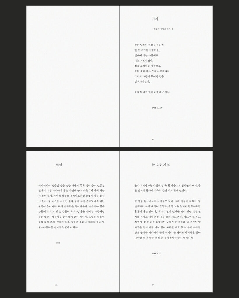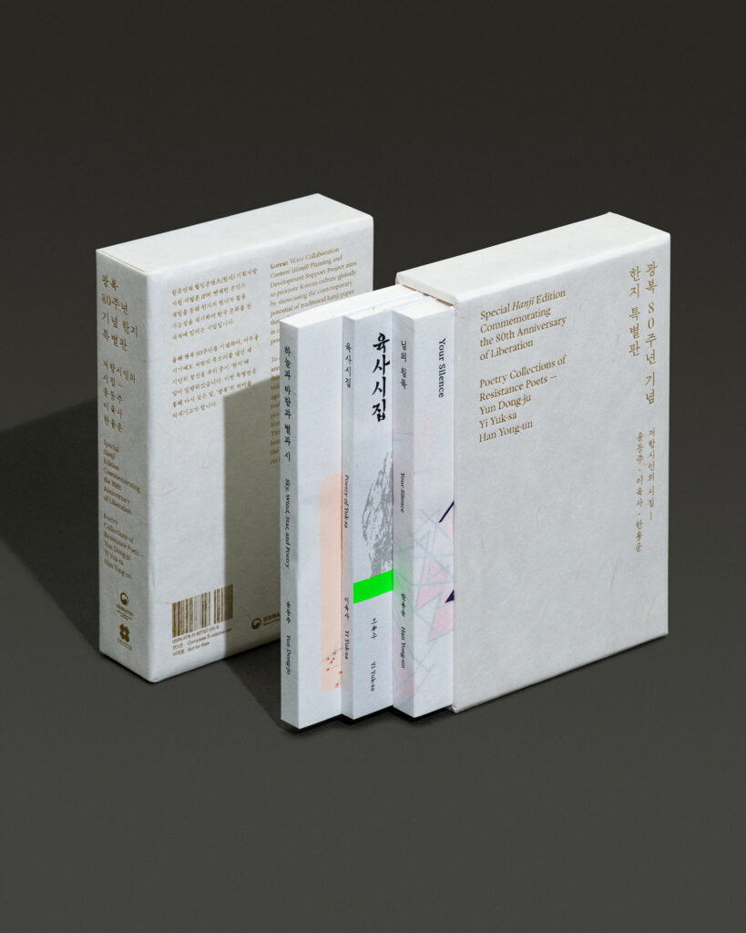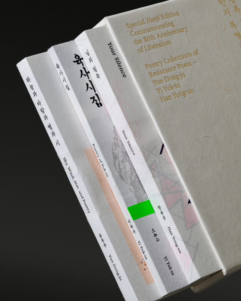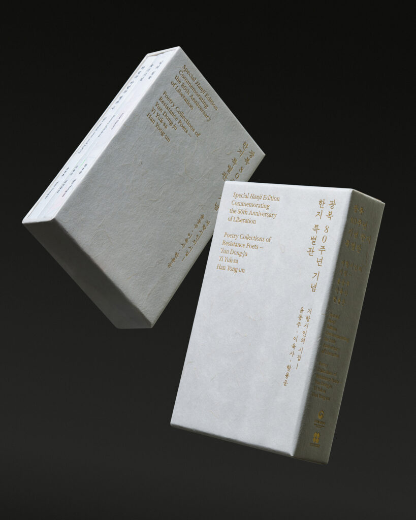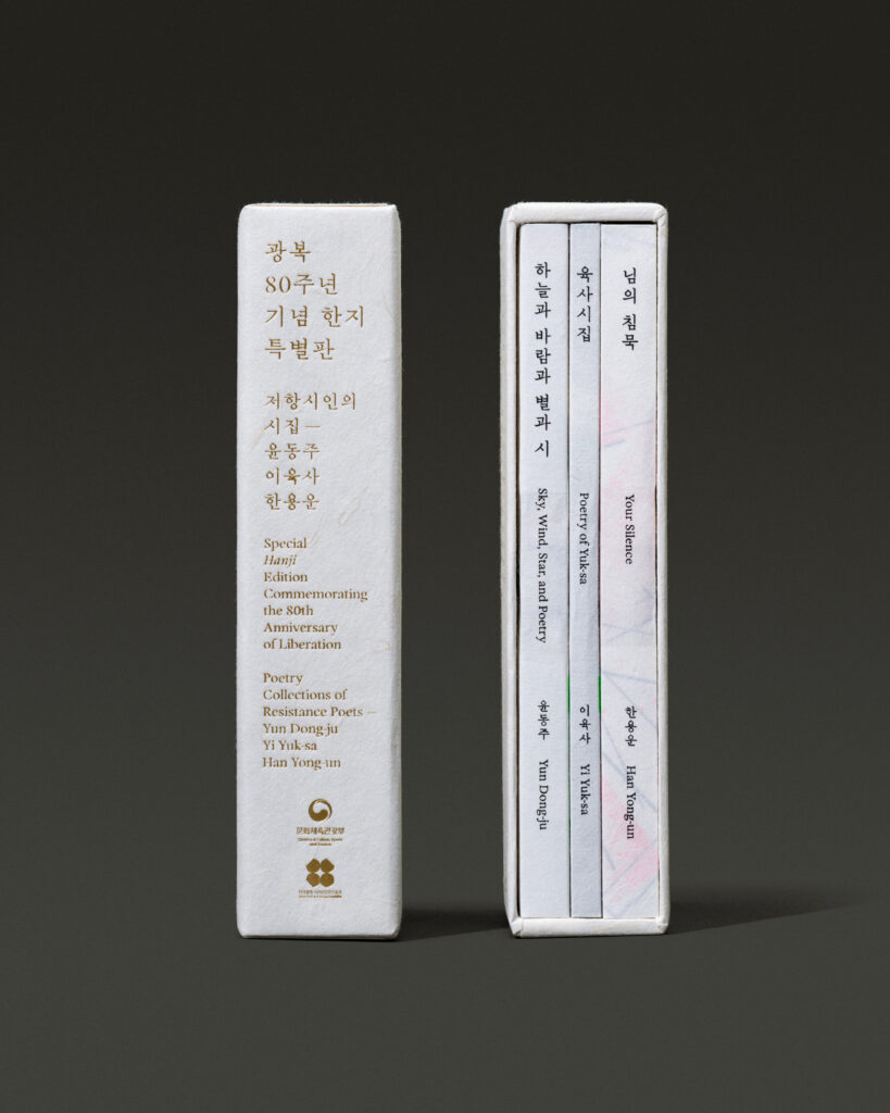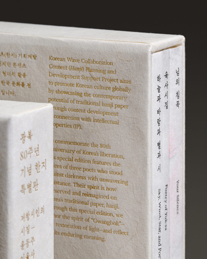 To commemorate the 80th anniversary of Korea’s Liberation, this project reinterprets the poetry collections of three iconic modern Korean poets — Sky, Wind, Stars, and Poetry by Yun Dong-ju, Poems of Yuk-sa by Yi Yuk-sa, and Silence of My Beloved by Han Yong-un — as a special edition printed on traditional Korean paper, Hanji.
